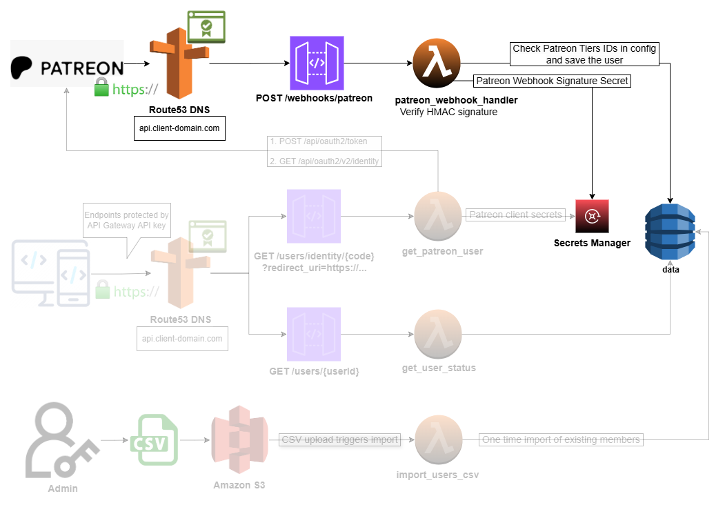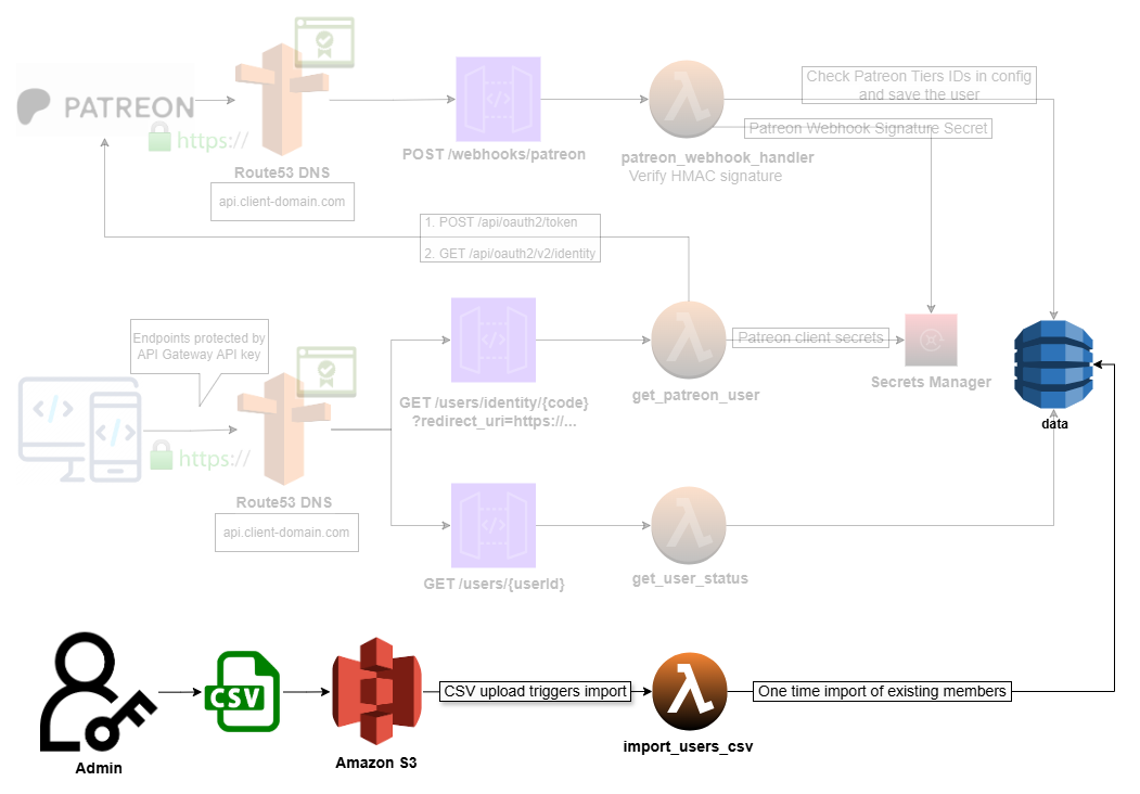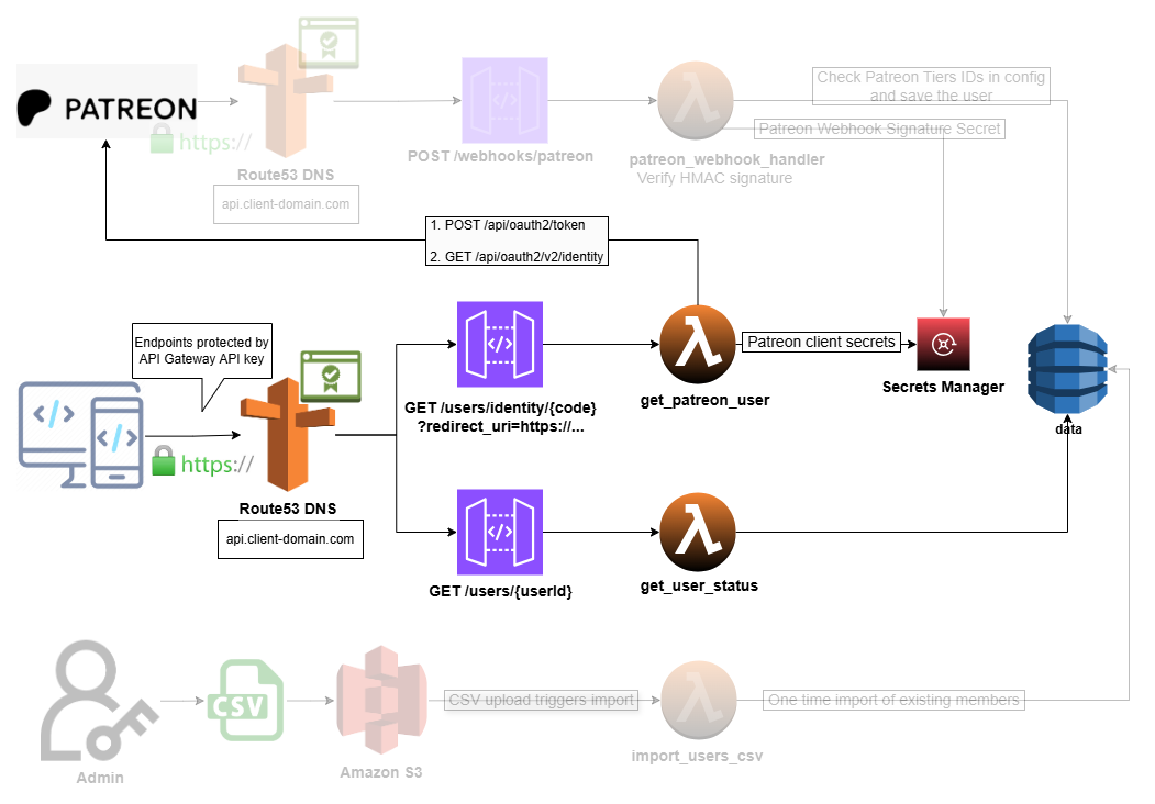The client's goal was to build an API for his website to filter the website content based on the user's Patreon subscription tier. I provided this as a scalable, robust, and secure serverless solution, that allowed the client to: